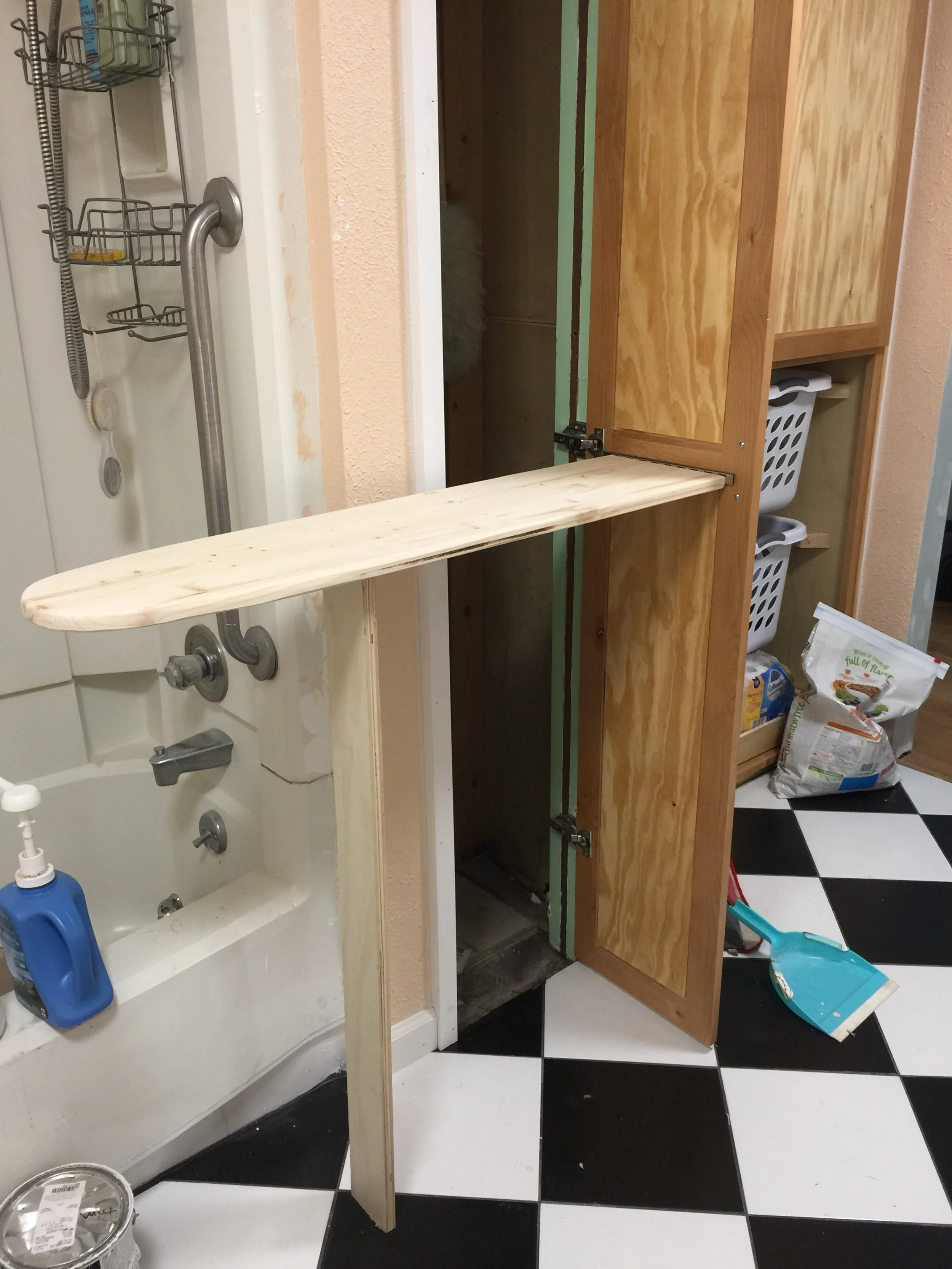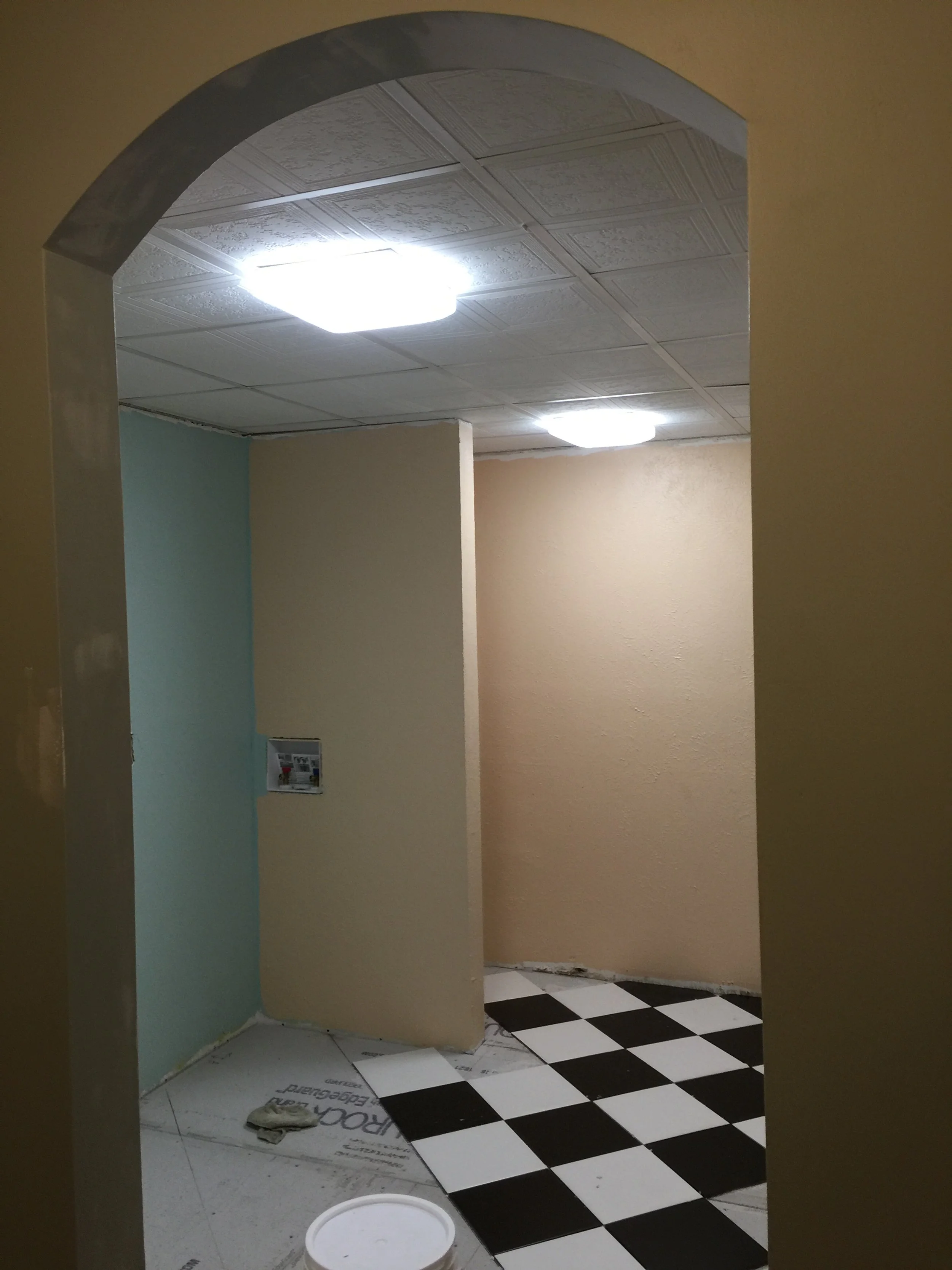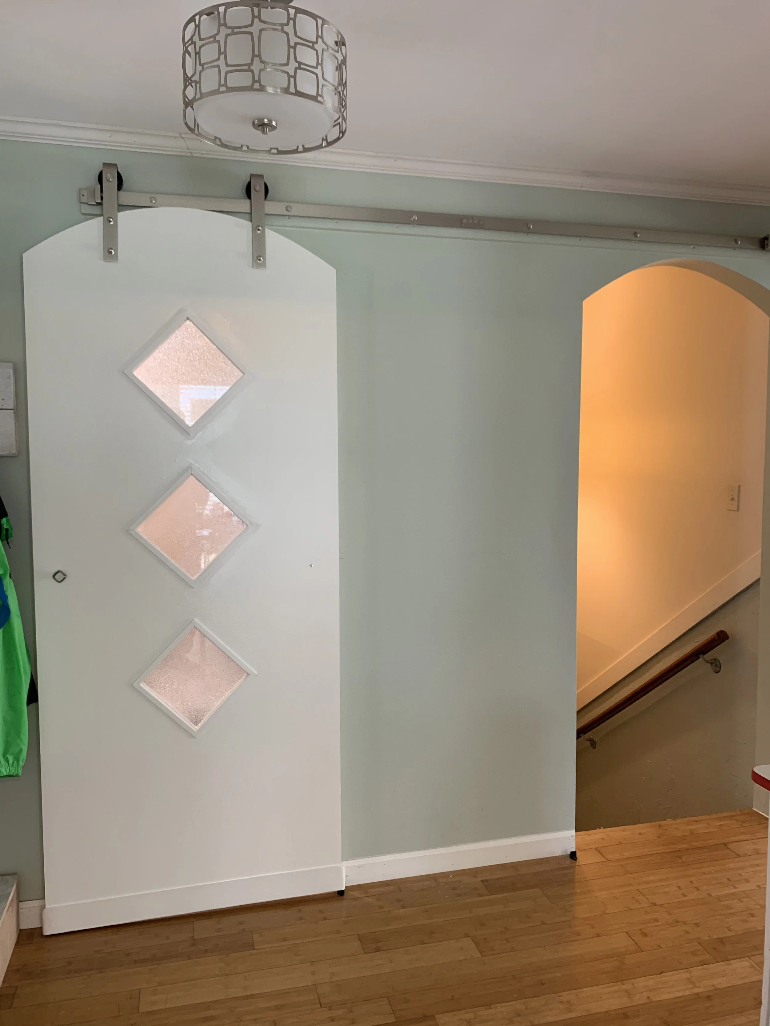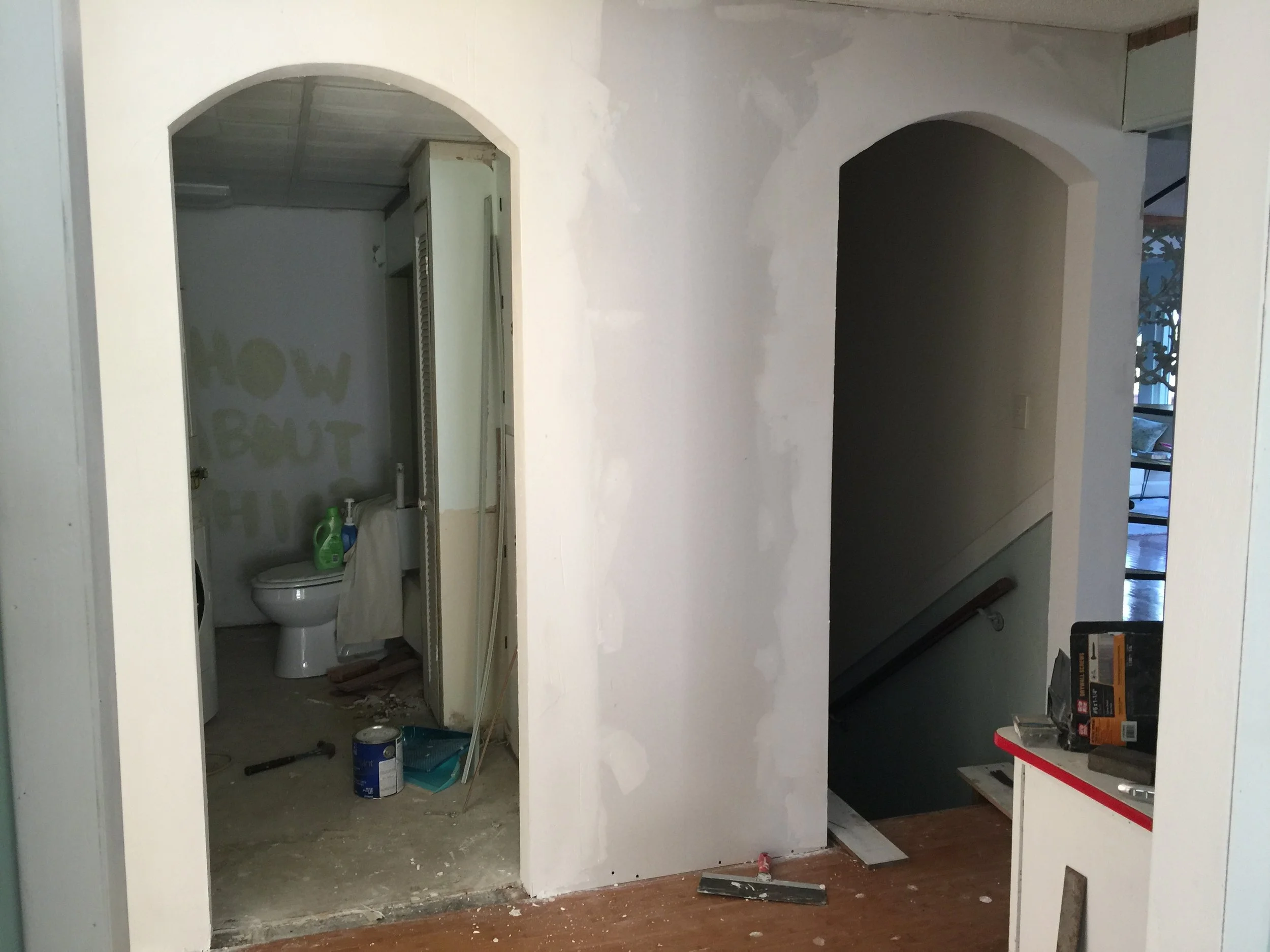 When we first moved in the Master Bathroom was located just inside the back door, a mile from the Master Bedroom. After we created a new Master Bathroom we began the process of transforming the old one into a mud room/laundry room/full bath. The old laundry room was located on the bottom floor and Cindy hated having to constantly go up and down the stairs to monitor the laundry. She wanted it on the main floor near the kitchen. After much deliberation, dreaming and scheming we launched into the project. The same weekend I began demo on the space we had guests in our upstairs Air B&B. The husband just happened to be a contractor who was there tagging along with his wife. She was busy during the day and he was bored. So he basically jumped in and jump started the project for me. It was great! He taught me a few tricks and saved me about two weeks of work. My Dad built the cabinets for me. We painted them white. The door to the bathroom will be on a sliding track and will slide to cover either the bathroom or the stairs. We occasionally have little ones running around so closing off the stairs is helpful. The space is working out great!